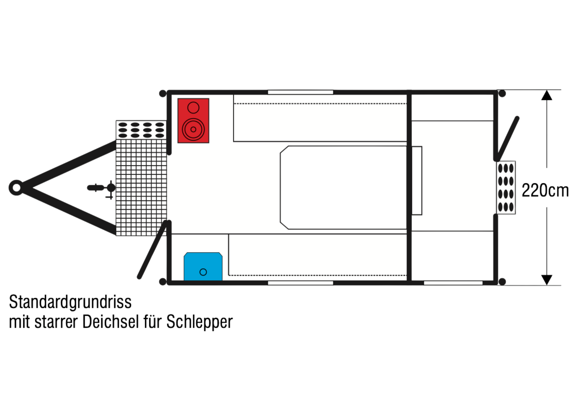 • Höhe: ca. 300 cm, Breite: 220 cm, Länge inkl. Deichsel: 570–635 cm